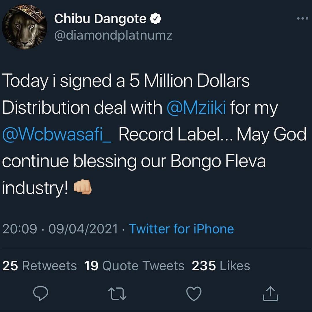 “Today I signed a 5 Million Dollars Distribution deal with @Mziiki for my @Wcbwasafi_ Record Label… May God continue blessing our Bongo Fleva industry!” his tweet read.