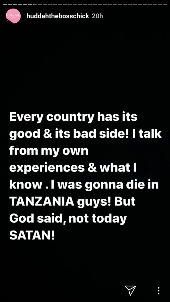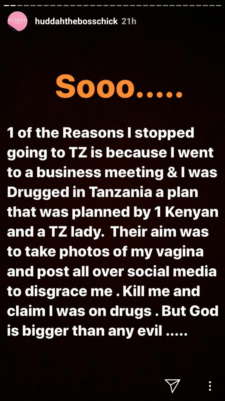 “Sooo…. 1 of the reasons I stopped going to TZ is because I went to a business meeting and I was Drugged in Tanzania a plan that was planned by 1 Kenyan and a TZ lady. Their aim was to take photos of my vagina and post all over social media to disgrace me. Kill me and claim I was on drugs. But God is bigger than any evil….” wrote Huddah Monroe.