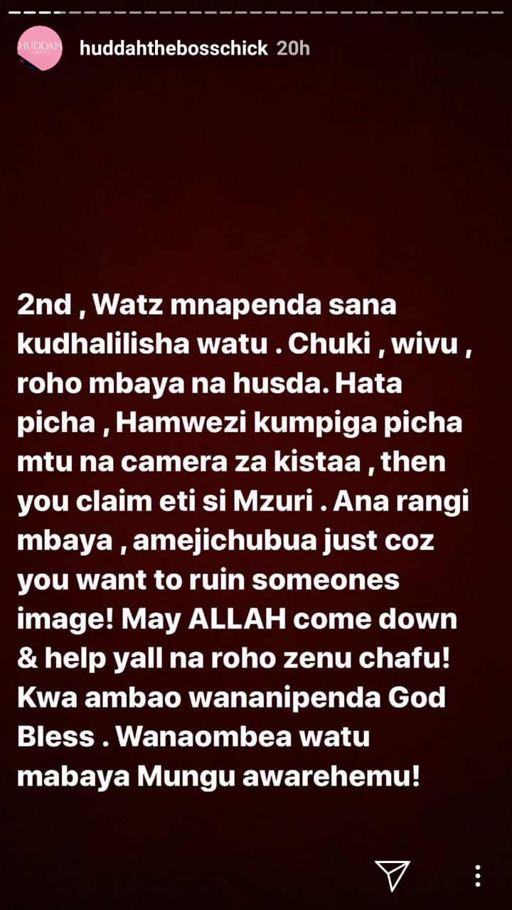 “2nd, Watz mnapenda sana kudhalilisha watu. Chuki, wivu, roho mbaya na husda. Hata picha hamwezi kumpiga picha mtu na camera za kistaa, then you claim eti si Mzuri. Ana rangi mbaya, amejichubua just coz you want to ruin someone’s image! May Allah come down and help yall na roho zenu chafu! Kwa ambao wananipenda God Bless. Wanaombea watu mabaya Mungu awarehemu!” wrote Huddah.