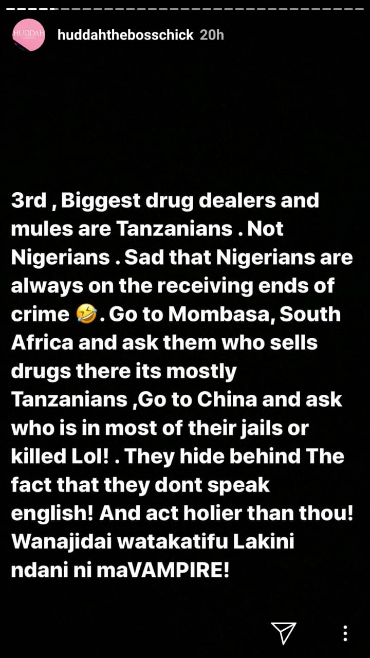 In another post, Huddah stressed that Tanzanians are the most notorious narcotic traffickers in Africa and not Nigerians. She said that Tanzanians are selling drugs in Kenya, South Africa and even China.